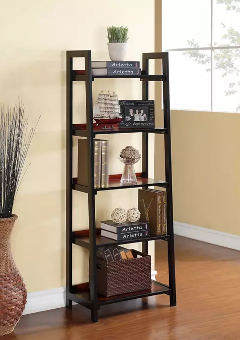 The Reid Collection has a transitional design and style. Perfect for small spaces, each item occupies minimal floor space but provides ample storage and display space. The rich Black Cherry finish exudes sophistication. Perfect for storing and displaying books and decorative items, the Five Shelf Bookcase is sturdy and durable. A functional and stylish addition to a home office or living space.